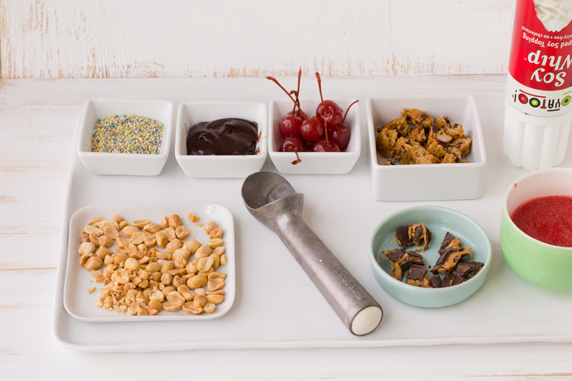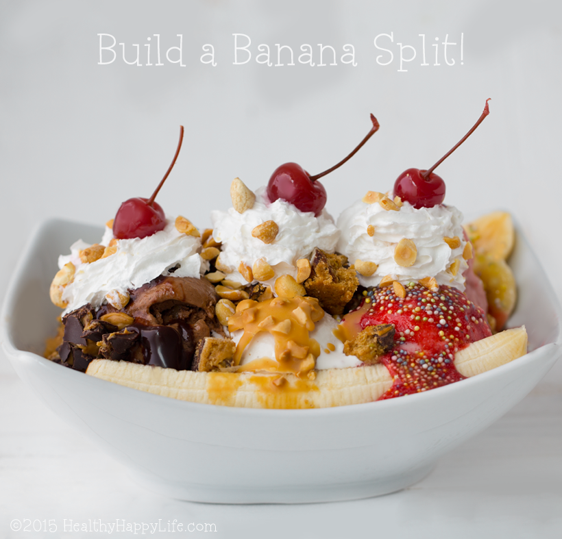 Ice Cream: I used the classic trio of flavors, dairy-free store-bought ice cream options. You can also use DIY banana ice cream for maximum banana goodness. (Which I plan on doing tomorrow during the party.)