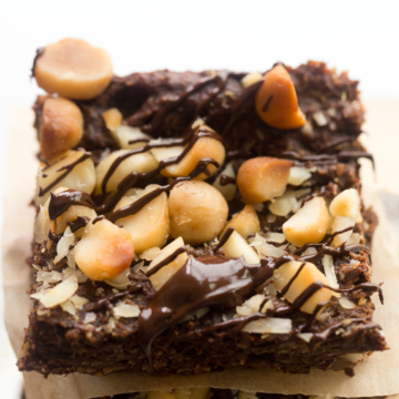 These rich and dreamy brownies and vegan and gluten-free with loads of goodies in each bite. Coconut, nuts and loads of chocolate flavor.