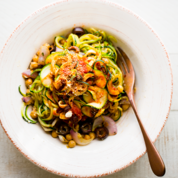 The bottom line for pasta lovers: Subbing in zoodles in place of traditional grain pasta is a super way to eat more veggies. And love every second of it. The secret to cooking them in a delicious way is really to flavor your zoodles the exact same as you would your traditional cooked pasta. Add your fave sauce, add spices, bean balls, sauteed veggies, mushrooms, fresh tomatoes, pesto sauce, garlic, add whatever you love and watch the flavors marinate the zoodles and create a dish that tastes very familiar.