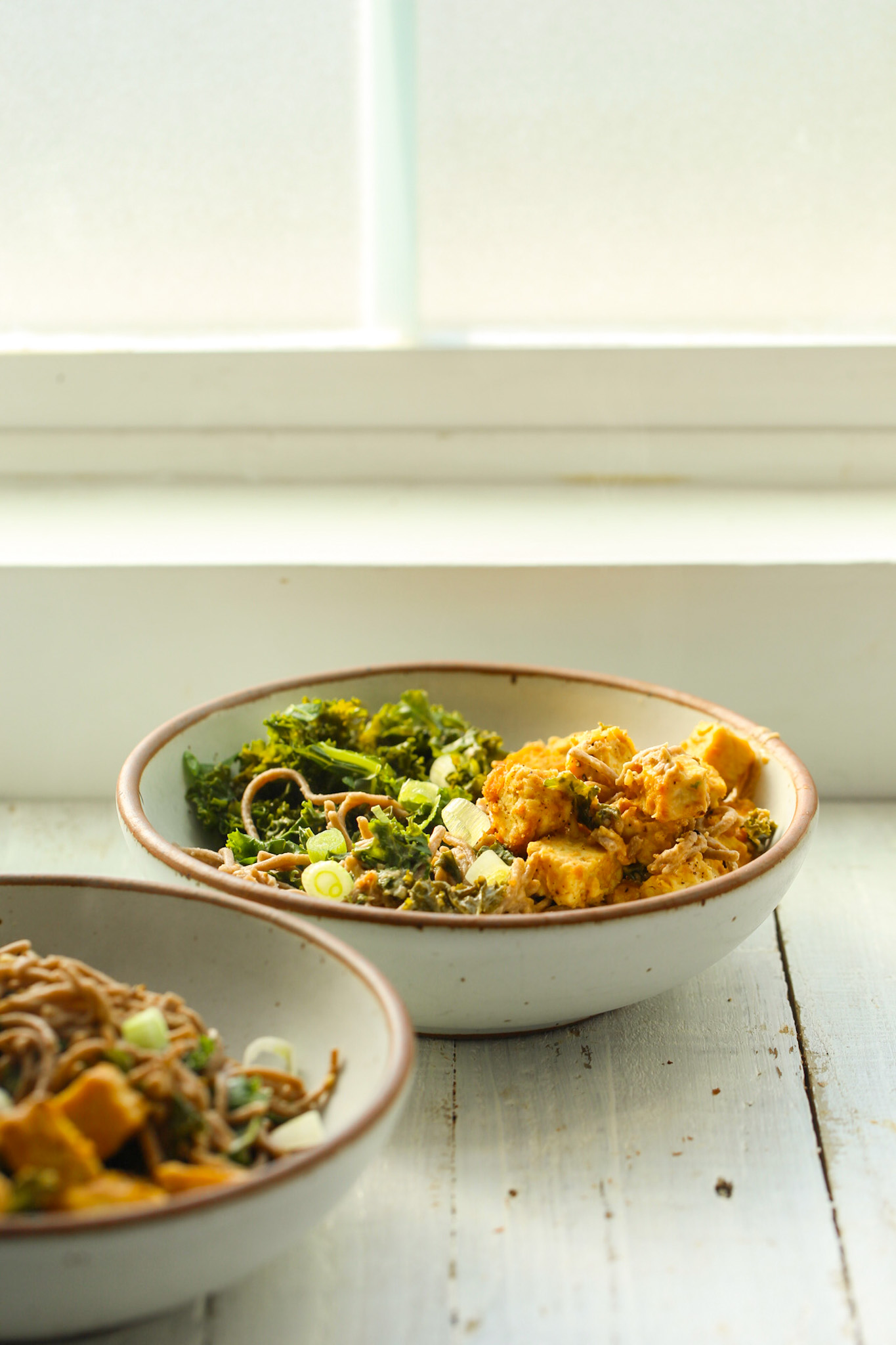 Kale + noodles + tempeh + peanut flavor. So good. Add hot sauce if you like heat.