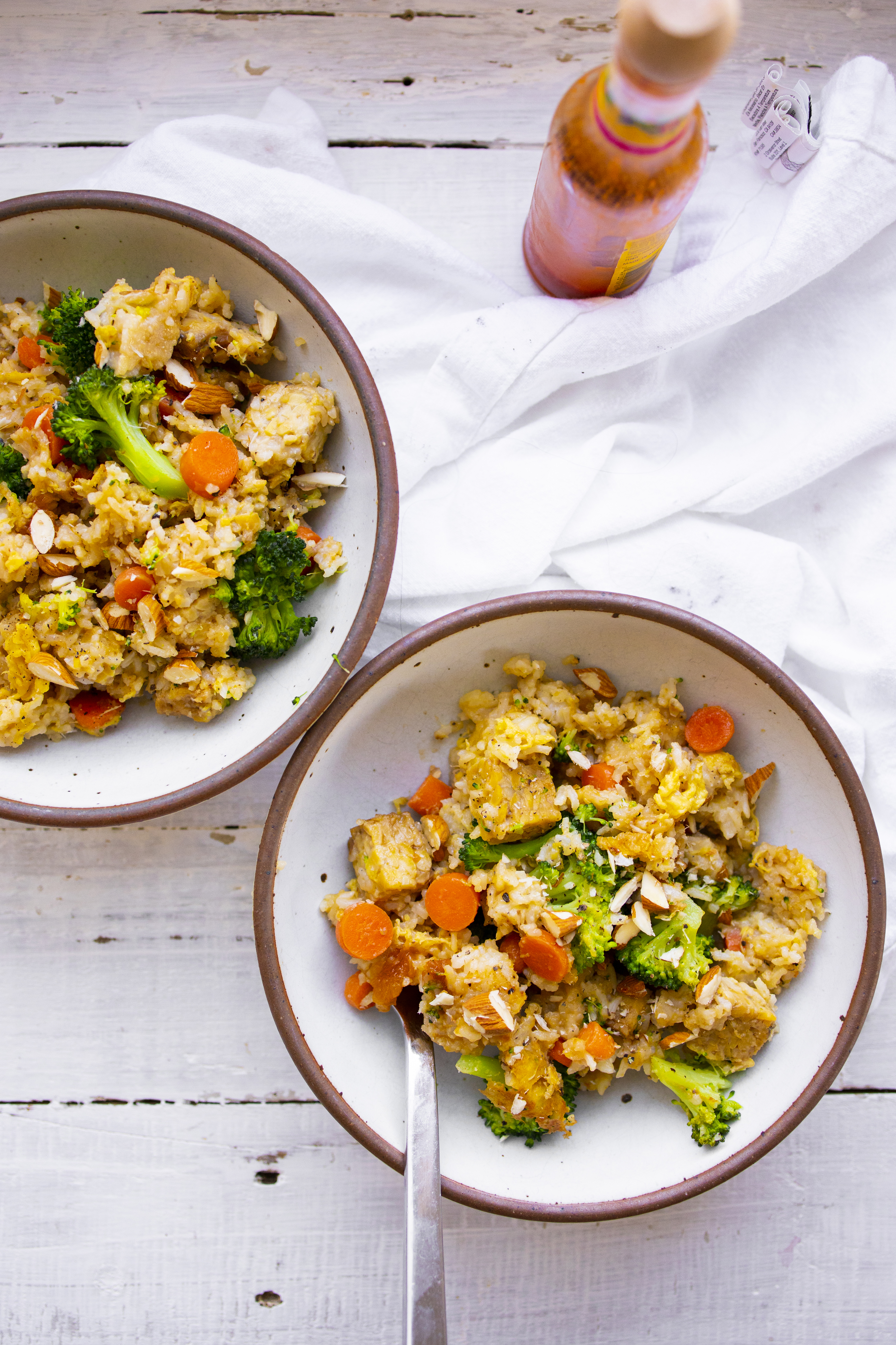Fried rice with an accent of protein-rich egg. But done in a vegan method.