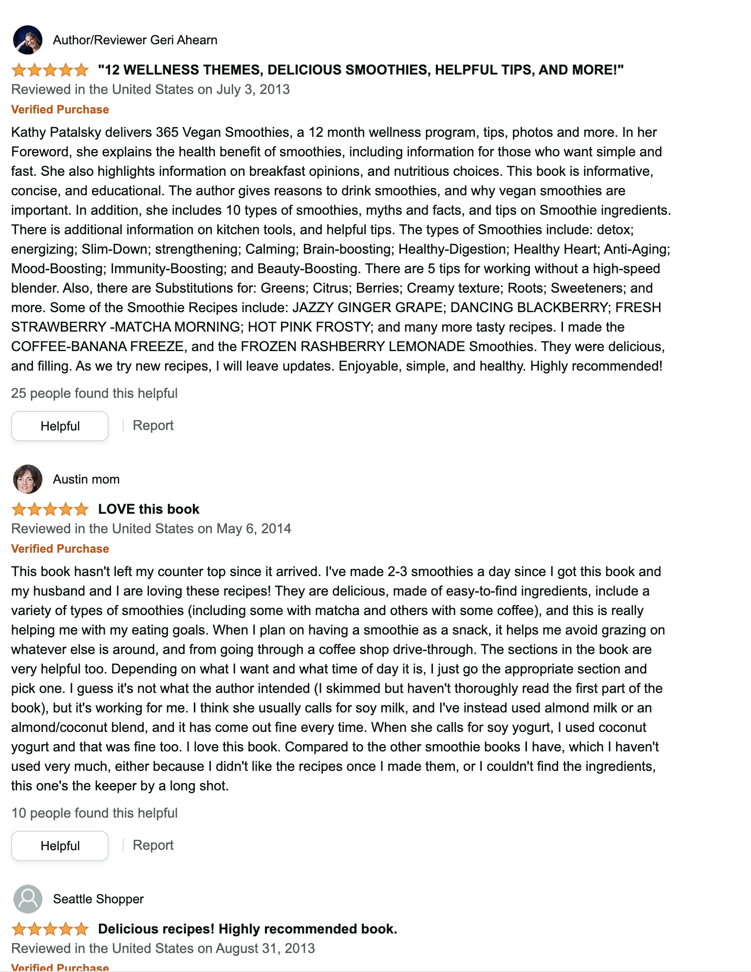 "Kathy Patalsky delivers 365 Vegan Smoothies, a 12 month wellness program, tips, photos and more. In her Foreword, she explains the health benefit of smoothies, including information for those who want simple and fast. She also highlights information on breakfast opinions, and nutritious choices. This book is informative, concise, and educational. The author gives reasons to drink smoothies, and why vegan smoothies are important. In addition, she includes 10 types of smoothies, myths and facts, and tips on Smoothie ingredients. There is additional information on kitchen tools, and helpful tips. The types of Smoothies include: detox; energizing; Slim-Down; strengthening; Calming; Brain-boosting; Healthy-Digestion; Healthy Heart; Anti-Aging; Mood-Boosting; Immunity-Boosting; and Beauty-Boosting. There are 5 tips for working without a high-speed blender. Also, there are Substitutions for: Greens; Citrus; Berries; Creamy texture; Roots; Sweeteners; and more. Some of the Smoothie Recipes include: JAZZY GINGER GRAPE; DANCING BLACKBERRY; FRESH STRAWBERRY -MATCHA MORNING; HOT PINK FROSTY; and many more tasty recipes. I made the COFFEE-BANANA FREEZE, and the FROZEN RASHBERRY LEMONADE Smoothies. They were delicious, and filling. As we try new recipes, I will leave updates. Enjoyable, simple, and healthy. Highly recommended!" - Author/Reviewer Geri Ahearn