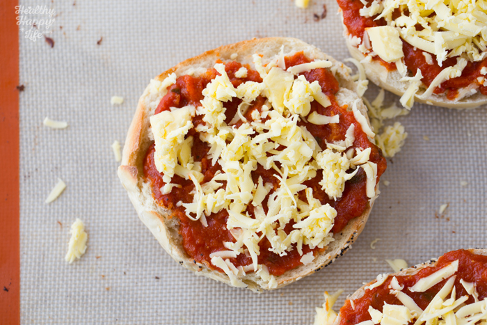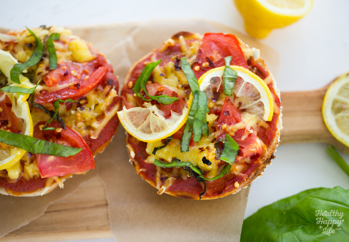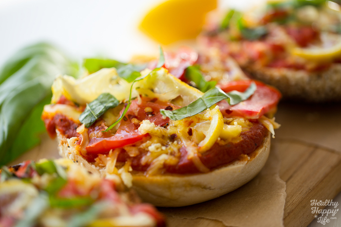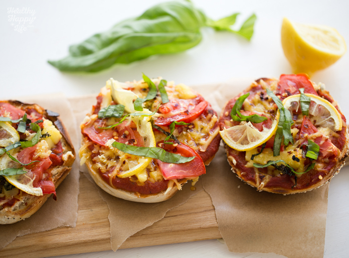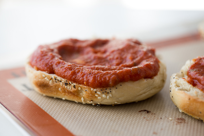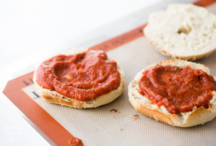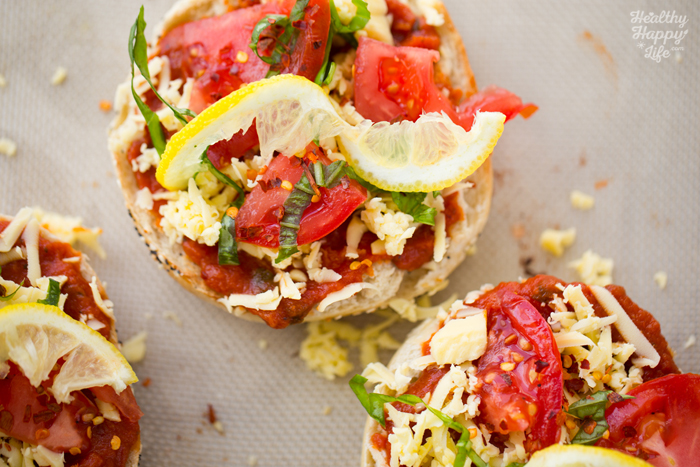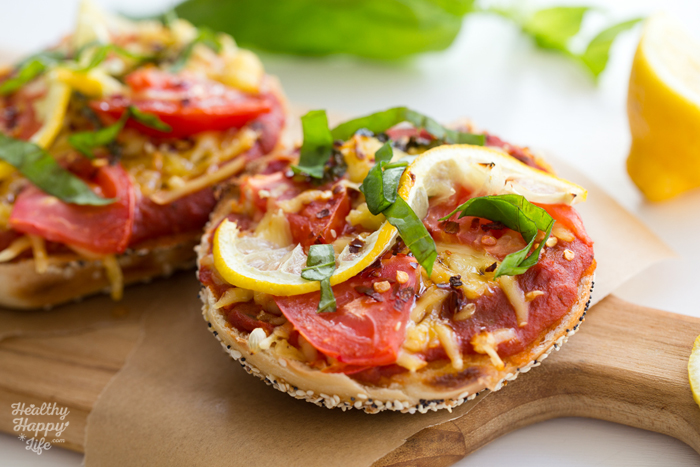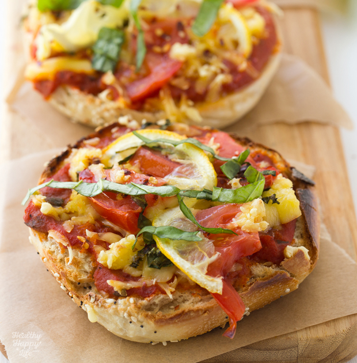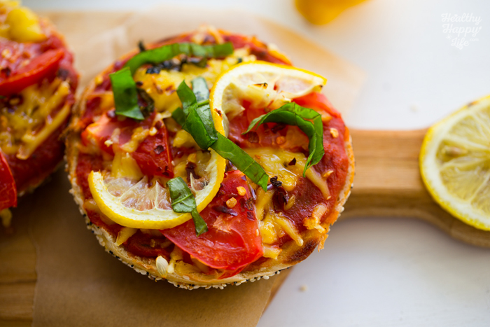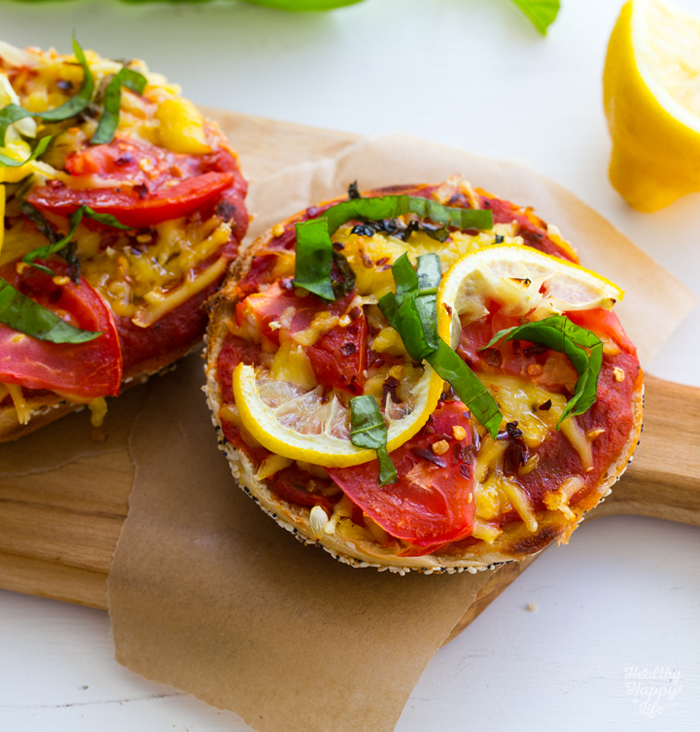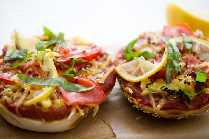- Assemble pizzas by spreading 1 ½ tablespoon marinara/pizza sauce on top of each bagel. Press the sauce into the bagel. Tip: For extra crispy pizzas you can lightly toast the bagels before adding toppings. Next add the cheese, tomatoes, optional nutritional yeast and red pepper flakes. Then add the lemon in a twirl on top. Drizzle EVOO on top of each pizza and also add a generous squeeze of fresh lemon juice over top.