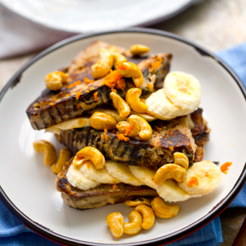 This super easy vegan french toast is booming with cravable flavors. Banana, cashew, citrus zest, cinnamon, candied cashews and coconut whip on top.