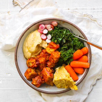 As I was plating this BBQ Tempeh-Kale Bowl, I was noticing how much the hummus looked like grits! And if for some reason you are out of hummus and/or cornbread, grits could totally sub for both in one component. Just top with the bbq tempeh and kale and done.