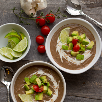 This easy, silky black bean mushroom soup is loaded with warming, savory flavor. Topped with a delicate lime cream and loads of buttery avocado.