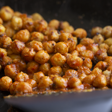 These Buffalo Chickpeas are spicy and tender with a textured, bold coating over top. A hint of sweet to sharpen the spice. The edges are caramelized and lovely, freshly served from a steaming hot skillet. Eat these bright red morsels all on their own or serve with vegan ranch and avocado for an amazing salad.