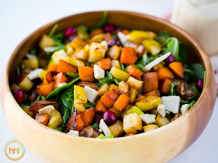 So you have a vegan entree, my mushroom tart, and a holiday dessert, my peppermint stick shake, and an amazing Christmas morning breakfast recipe, my vegan pancakes. Now we need some Season's Green-nings happening on the holiday feast table. So today I am sharing a creative spin on a plain old cold salad. My HOT + COLD Butternut Apple Maple Toasty Pecan Holiday Salad with Tahini-Ginger-Citrus Dressing. This salad recipe is perfect for a feel good entree or holiday feast side dish.