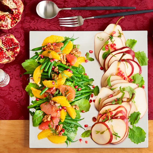 Another yummy salad to try!.. This Winter Citrus Salad from Dole - This medley of citrus, pomegranate and greens is every bit a colorful showpiece. Layers of baby kale, citrus and green beans are arranged with delicately sliced red pears. Add a sprinkle of mint leaves for a cheerful finish, and serve with citrus vinaigrette: