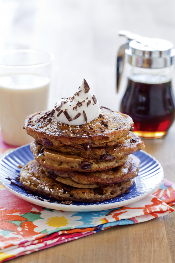 3. For the pancakes, in a large bowl, whisk together flour, baking powder, espresso powder, and salt. In a separate small bowl, whisk together water, maple syrup, and rum. Add wet mixture into dry mixture and whisk until just combined. Do not overmix; batter should have some lumps. Gently fold in chocolate chips.