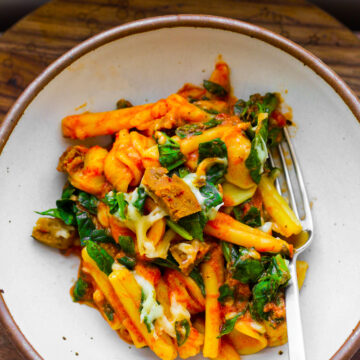 This Easy Cheesy Pasta Bake with Spinach and Vegan Sausage was the perfect easy and satisfying meal yesterday for an early dinner. Layers of tender pasta are marinated with tomato sauce, clustered with loads of wilted spinach and melty cheese shreds. A sprinkle of vegan sausage on top for added flavor and protein.