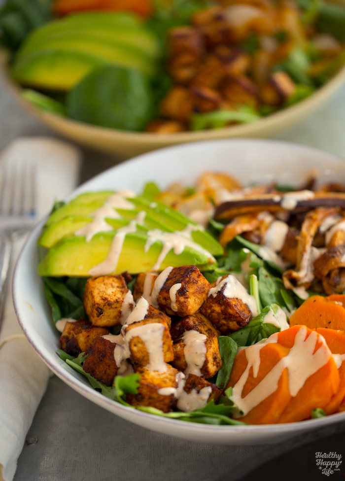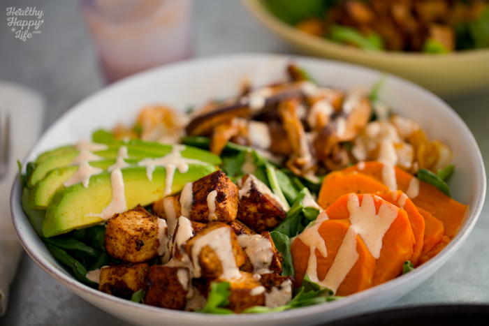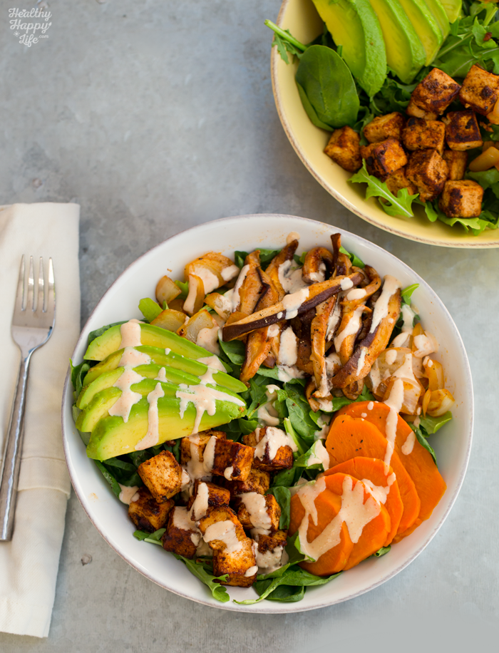 - Ready to assemble! Add two cups of greens to each serving bowl. Then add the sliced avocado and slices of cooked sweet potato. Then add the onions and mushrooms. And finally, add those sizzling hot tofu cubes. Drizzle the creamy sauce on top and serve! Optional: add nutritional yeast and lemon sprinkle over top!