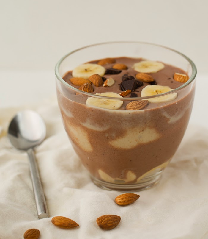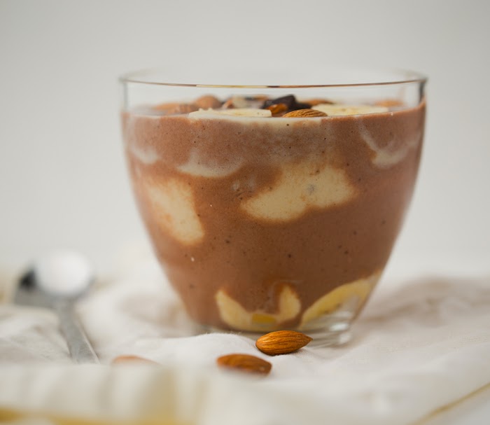 - Assemble bowl or glass: Add the fresh sliced bananas to the bottom of the glass - leave about 2-4 out for garnish. Scoop ½ of the chocolate mixture into the bowl. Then add all the yellow banana mixture (that you set aside) then top with the remaining chocolate mixture. Add toppings: almonds, banana, chocolate chunks and serve!