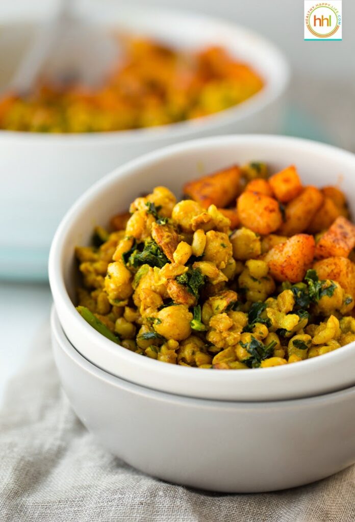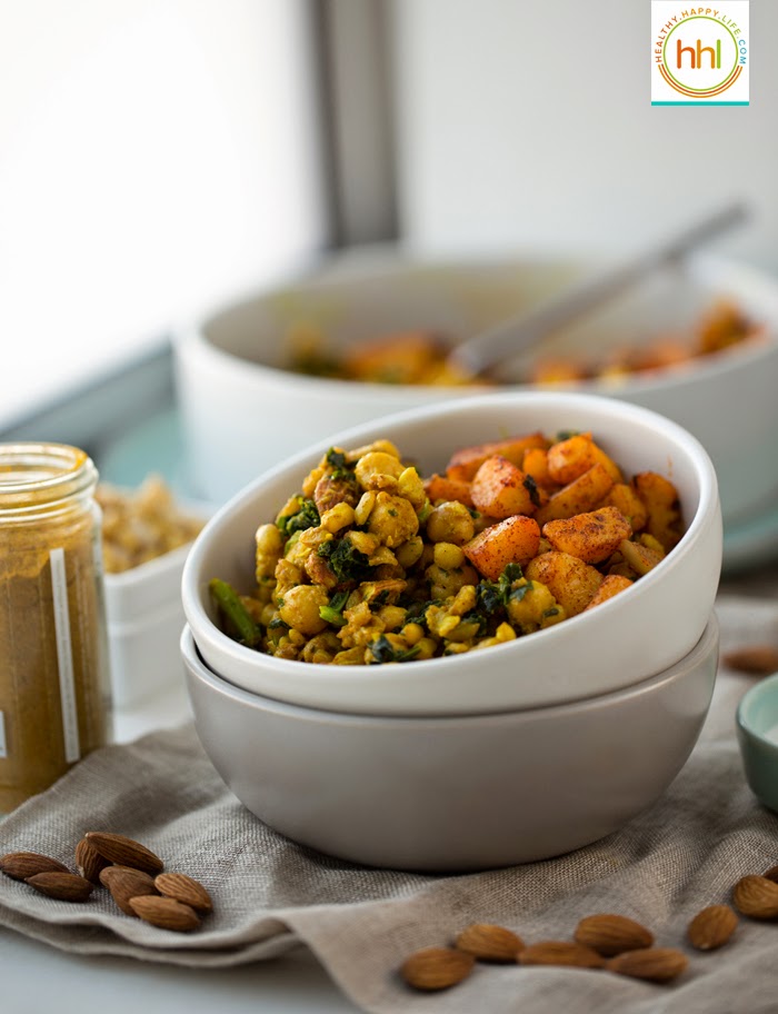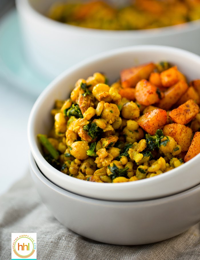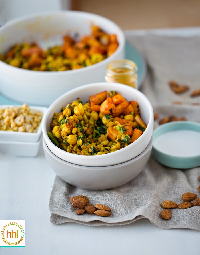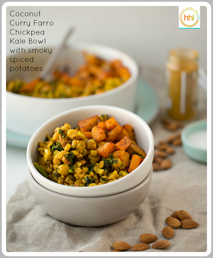 This entree is soothing and nutty yet spicy with a hint of luxurious sweetness from coconut milk and candied almonds. Not to mention that this is a super healthy meal, rich in whole grains, nutritious beans, nuts and veggies like kale and potatoes. Are you craving it yet? I hope so! Put my Coconut Curried Skillet Farro and Chickpeas with Smoky Potatoes on your menu this week!..