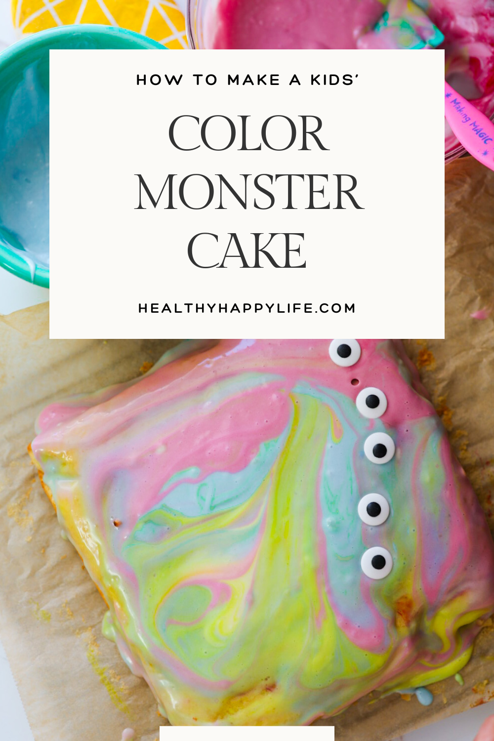 - When cake is cool, swirl the different colored frostings over it. Then add candy eyeballs! Serve!
