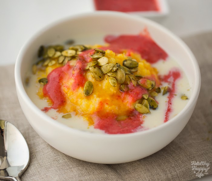 - Turn off heat and pour polenta grits into two serving bowls. Top with the pumpkin seeds, non-dairy milk and swirl strawberry sauce over top.