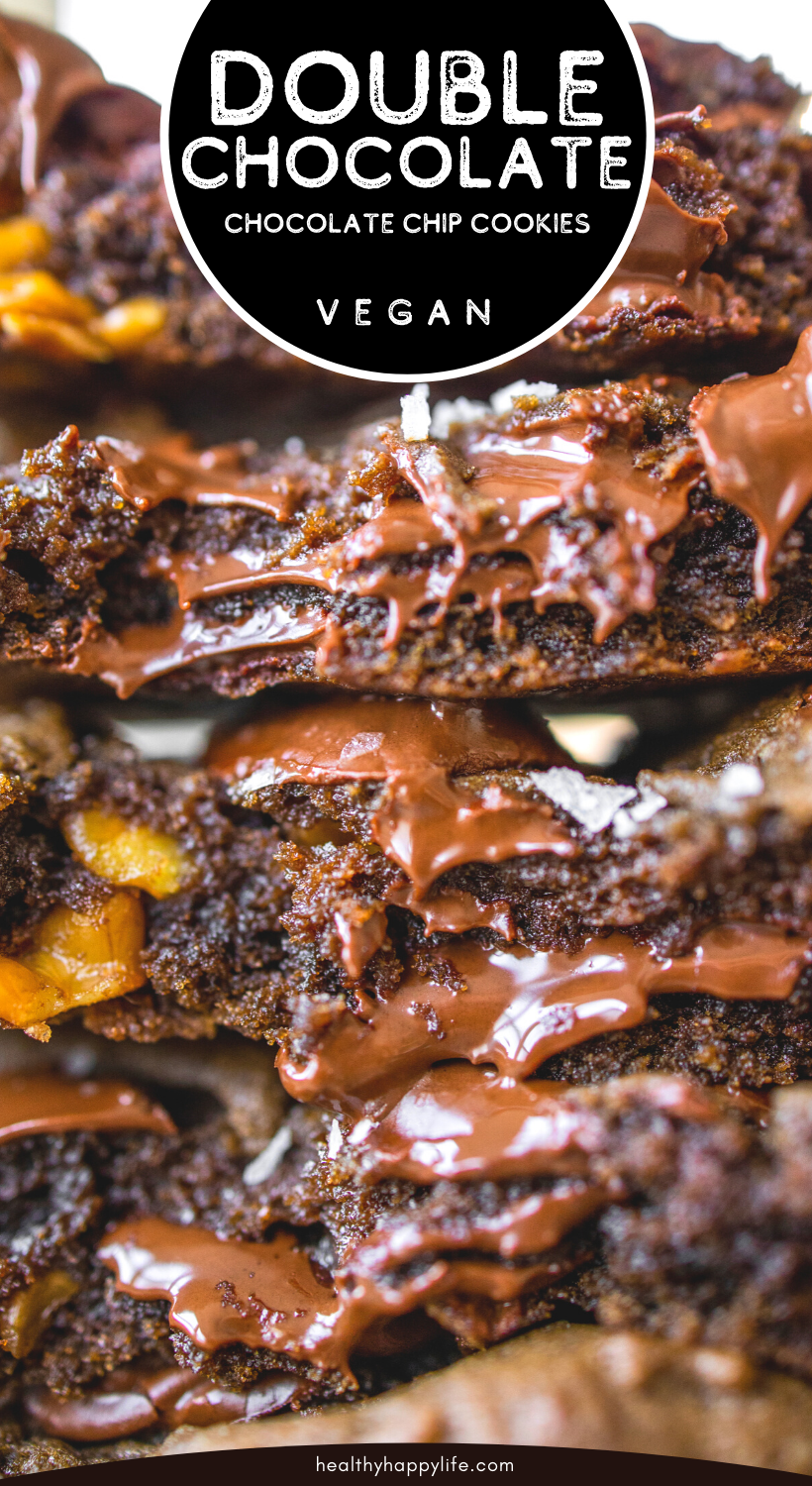 These vegan Double Chocolate Chip Cookies are simple in form and big on chocolate flavor. Perfect for making for a party or just to have on hand to nibble during the holiday season. Sorry, gingerbread men, these cookies might steal a bit of your spotlight this year.