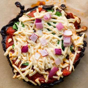 How to make these a meal? Serve a giant platter of them! Kinda like sushi. I think 2-3 pizzas per person (average sized portobellos) is a good portion. Load on even more toppings if you want a heartier bite. You can also always lighten up the vegan cheese if you want. I clearly got very into the "cheesy" part of these pizzas and loaded on the shreds! The cheese I used was Daiya, but there are a few awesome mozzarella brands like Follow Your Heart and even Miyoko's Kitchen. Check out my vegan cheese guide for more cheese brands and tips!