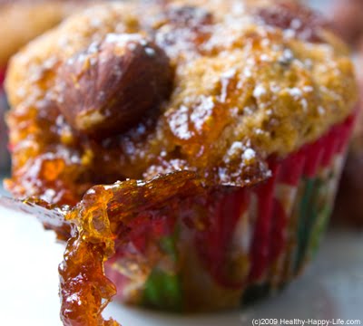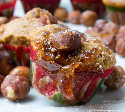 6. Dollop about ½-1 teaspoon fig jam on top of each muffin. Use more or less to suit your tastes. Top each muffin with a hazelnut.