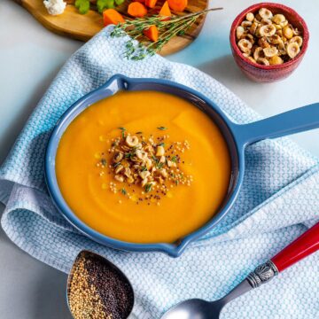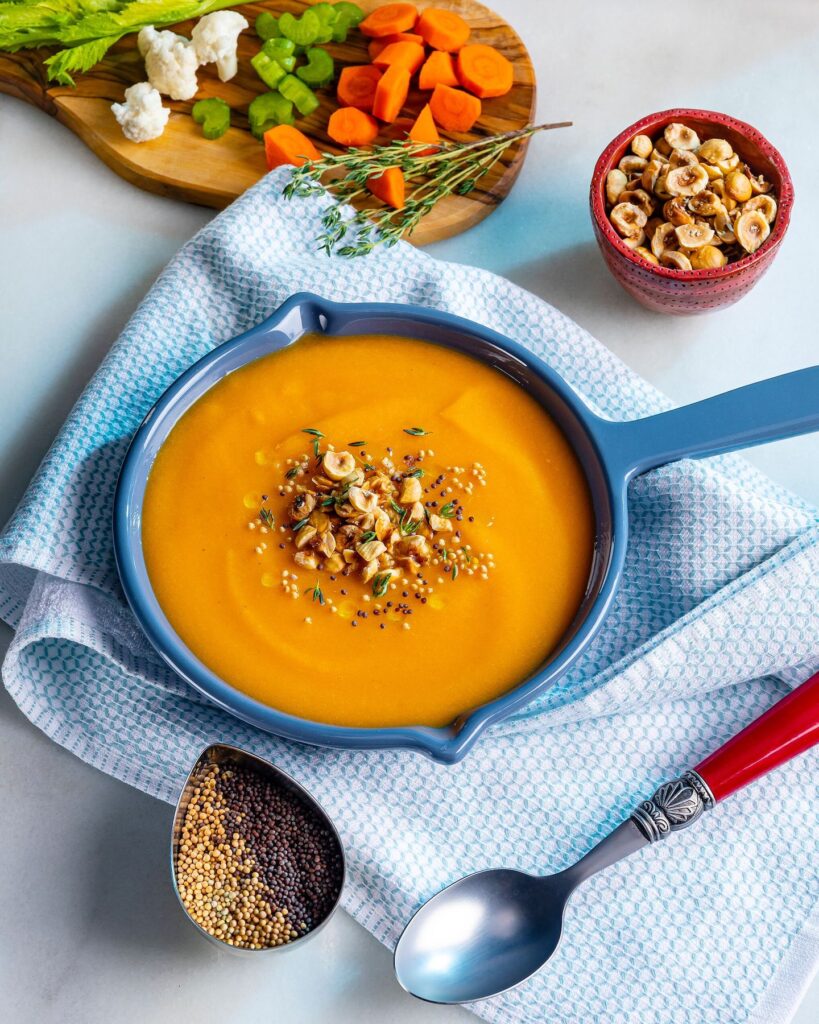- SERVE soup topped with hazelnut mixture garnished with oil and thyme, if desired.
