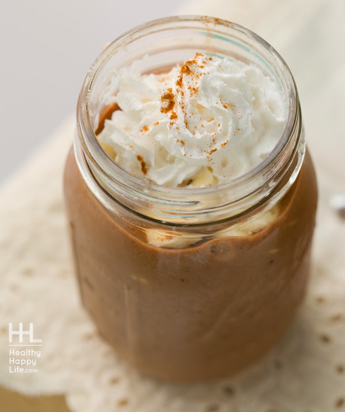 This is an easy recipe everyone. But one that is fun for anyone in a hot cocoa mood, minus the hot. Whip up a frozen banana-based shake with accents of cinnamon, nutmeg and cayenne and loads of rich cocoa, swirl some non-dairy whip on top, add a few slices of banana on top for some bite and call it a frozen hot chocolate. Santa would approve!