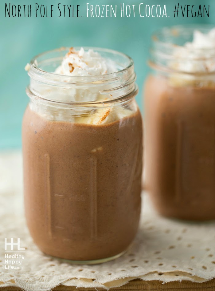 Even if gentle snowflakes are silently falling outside your window. Or a brisk cool chill nips at your nose when you step outside. Inside, you may have a hum of warmth and light. Twinkly lights and a crackling fireplace, or even a cozy giant sweater and fuzzy socks to bundle up in. Sometimes, yes, sometimes, you may crave a cool treat even during these winter months. So here is how I whip up my favorite vegan Frozen Hot Cocoa, North Pole Style..
