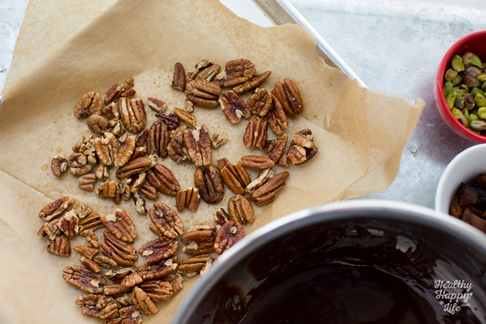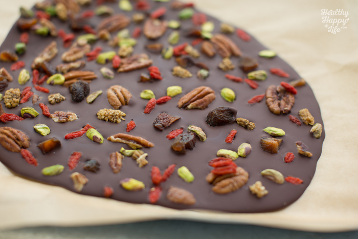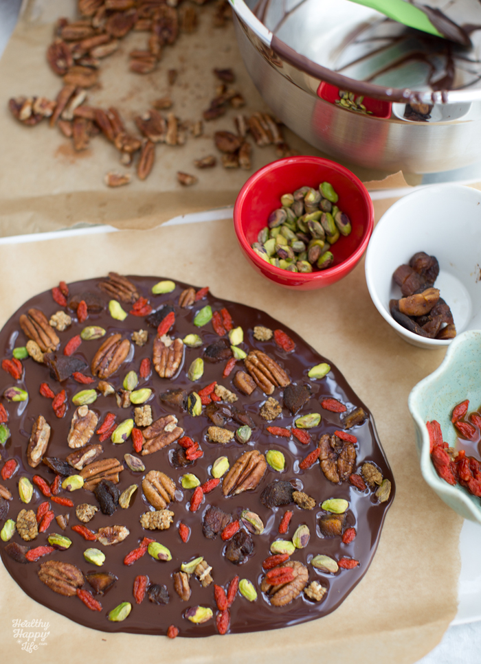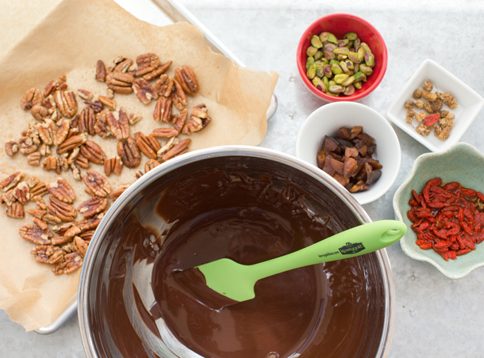 4. Add the pecans, apricots, goji berries, pistachios, optional dried goodies and anything else you want to add to the melted chocolate layer.