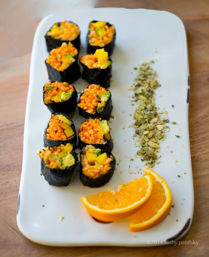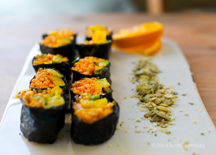 3. Tightly roll the nori into a burrito shape with open ends. Let it sit for at least two minutes before slicing. Slice roll into one inch thick rounds and turn on their sides to arrange the rice facing up. Serve with tamari, wasabi and ginger if desired. Or just a few orange slices. Pumpkin seeds: you can sprinkle these over top the rolls, along the side or inside as desired.