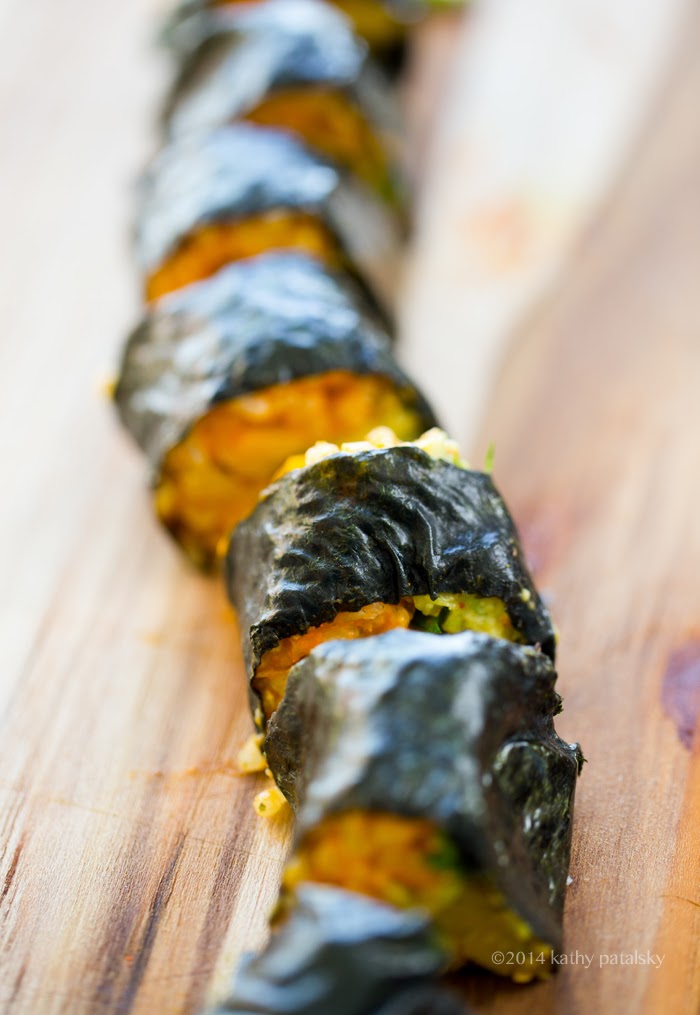 Rice: The rice is an important part of sushi since it is the glue that really hugs all those veggies and filings together. Traditional sushi rice is made using white short-grained "sushi rice" and accented with rice vinegar, a hint of sweetener and salt. For my untraditional sushi rice, I would by default use brown rice and add a splash of seasoned rice vinegar, maybe a few drops of sesame oil too. But for this recipe I put my creative hat on and added some spices and citrus. Again, sushi is so much better when you get creative!