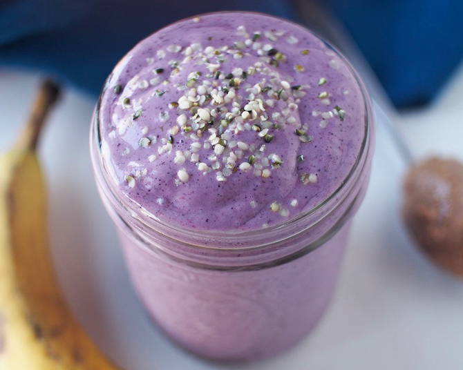 The color of this Peanut Butter Jam Blueberry Protein Smoothie by Crazy Pants Cookin'