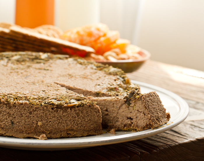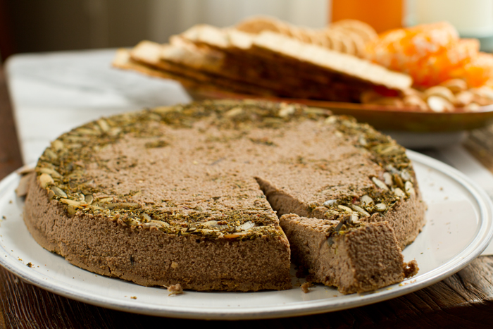 At first glance, as I popped this round out of its pan and settled it on a plate, I was worried. A brownish-grey recipe dish? Great! How do I photograph and 'sell' this recipe? Then I took a bite. And all anxiety dissolved as I melted into the amazing peppery-nutty--earthy-cheezy flavors and thick yet velvety, fluffy soft texture. This Herb-Crusted Peppercorn Lentil-Nut Pâté is not to be missed...