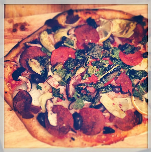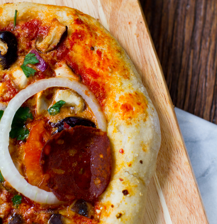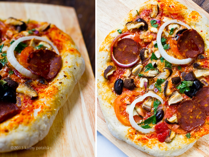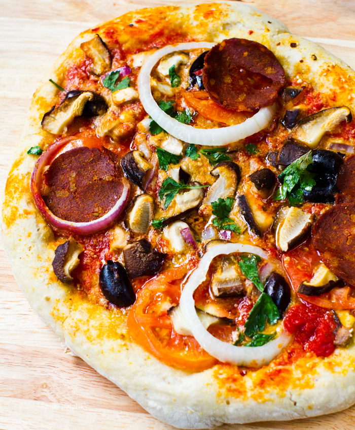 ..This pizza included some of my fave toppings including shiitake mushrooms, sweet onions, vegan pepperoni and kalamata olives. (I also LOVE squeezing fresh lemon juice on my pizza before baking!)