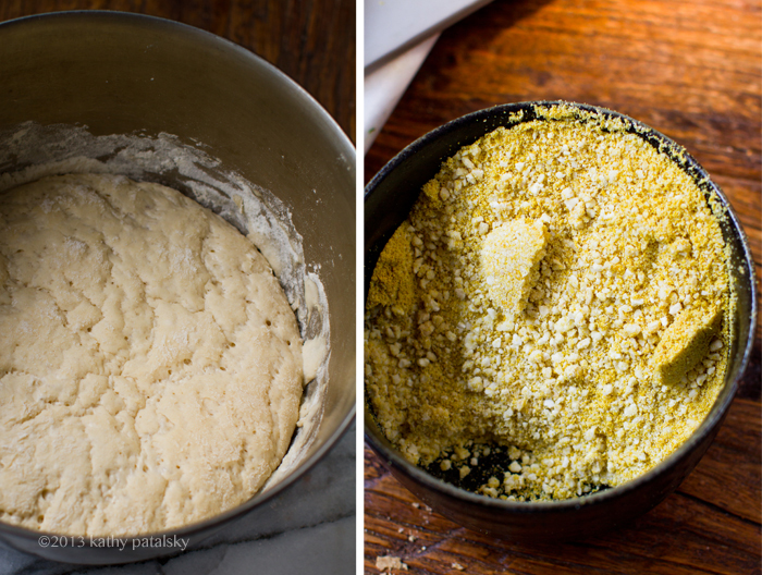 5. Start rolling, tossing and stretching the dough to form a pizza shell. Press out the dough on your baking sheet or pizza pan that will go in the oven. If using corn meal, run the dough through a bit of corm meal so it lightly coats the bottom of the crust and edges.
