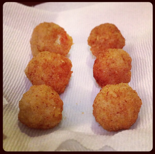 5. Start heating your oil in a pot. I did high heat for about 2 minutes then reduced to medium and starting adding balls. Allow 2-3 minutes in the pan for each ball. Turn gently to evenly fry all sides.