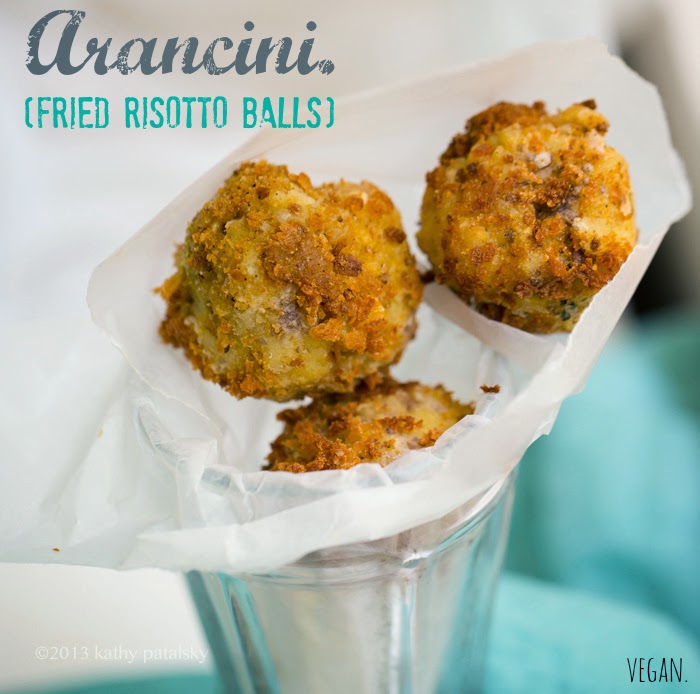 Risotto is one of my favorite recipes ever. And for years I have been ogling a recipe called "Arancini" aka "fried risotto balls." I remember watching Giada's cooking show a few years ago as she was whipping up the golden fried balls. They looked like bliss and the way she swooned after a bite I knew they must indeed be pretty amazing. But her recipe used all the traditional ingredients. Egg wash. Dairy cheese filling. Bread crumbs that may contain non-vegan seasonings or additives. And her risotto may not have been vegan to begin with. So I stalled on giving the recipe a try, unsure about how a vegan version would turn out.