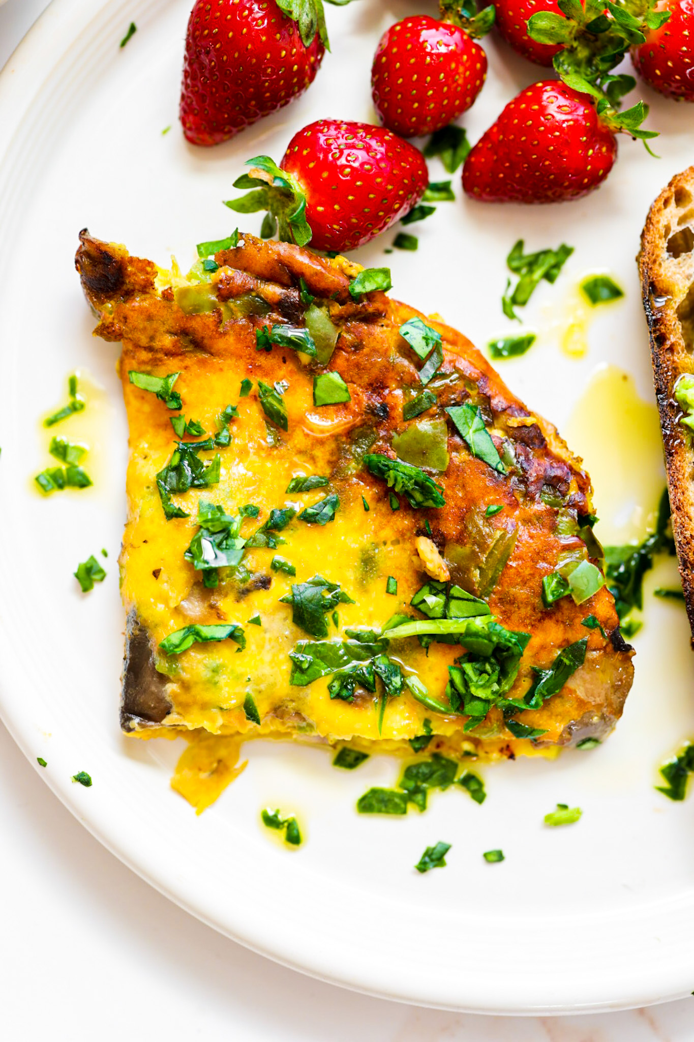 - When your omelette is cooled enough. loosen the sides with the spatula, then flip. slice and serve warm. I like a sprinkle of freshly chopped herbs or spinach over top.