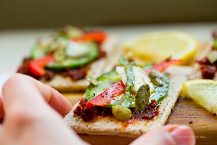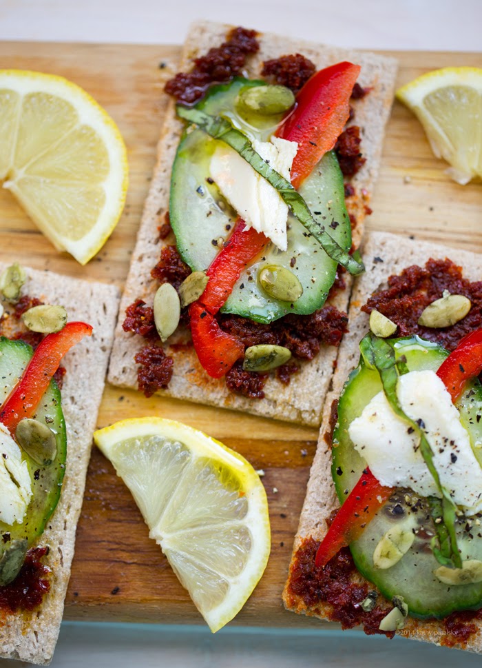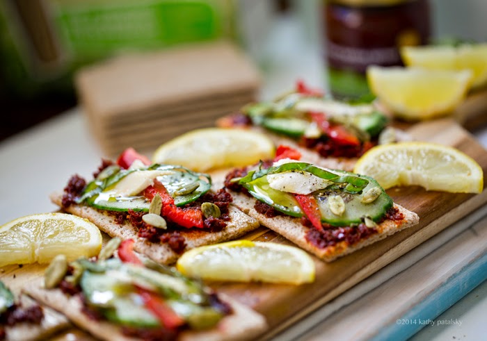 This spicy meets cool vegan appetizer cracker combines harissa, cucumbers, lemon, basil and more for a flavor sensation that you will want to nibble again and again. Vegan party snack winner.