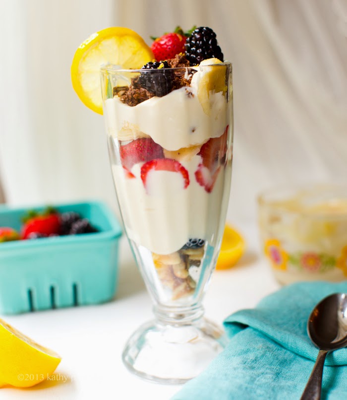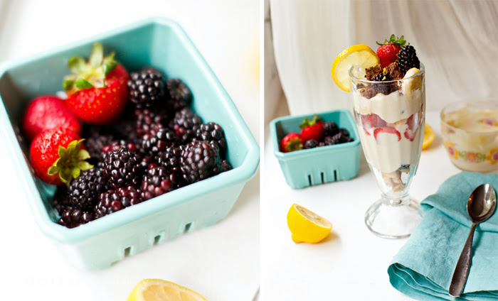 7. Serve by assembling your parfait in layers. Alternate add berries and crunchy toppings to a tall parfait glass. Garnish with a few pretty berries and a lemon slice.