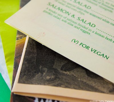 Symbols. First, when I see a restaurant taking the time to put a special symbol on their menu representing items that are low-fat, low-calorie, vegan, dairy-free or vegetarian. A perfect example of this is the little carrot that Le Pain Quotidian puts next to all its vegan menu items. Listen up menu designers: A simple (v) on the menu is a great way to indicate whether or not items are vegetarian or vegan-just be sure to specify what the symbols stand for!