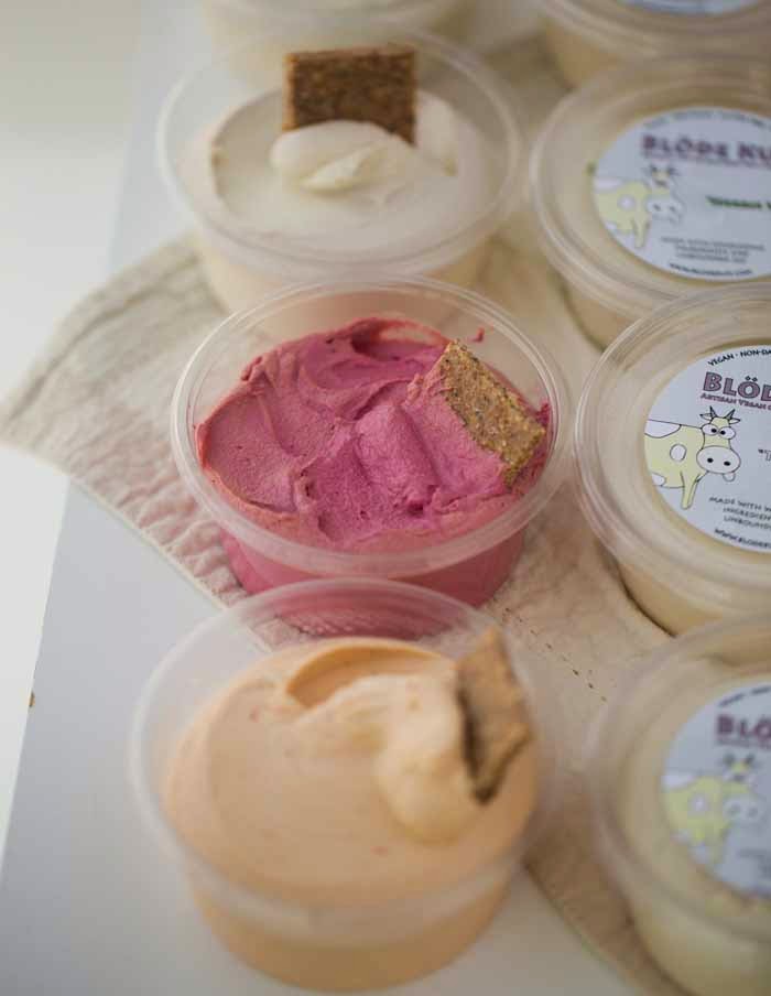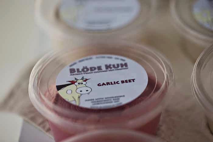 A: Douglas: We use a custom blend of cultures (grown on a vegan and non-allergenic medium) to jump-start the fermentation process for our cheese. For DIY makers, haphazardly using cultures is going to be hit and miss and not really worth the effort. We always encourage making rejuvelac (a fermented beverage derived from sprouted grains) for homemade nut cheeses. We always used this when we started making it at home for family and friends, and, after we got the hang of it, it would turn out a tasty product (albeit with different flavor notes) every time. The reason we switched to cultures when we started Blöde Kuh is it’s difficult to keep the potency and flavor notes consistent from batch to batch when using rejuvelac.