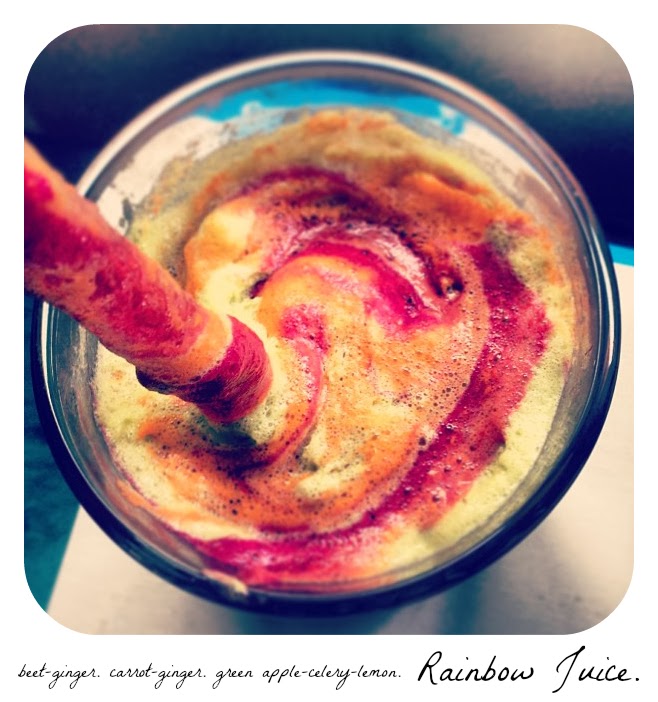 Rainbow Juice Recipe: ⅓ beet/ginger juice + ⅓ carrot/ginger juice + ⅓ green apple-celery-lemon-ginger-cayenne juice. Swirl well. Add splashes of coconut water to make the flavor less bold (if desired). Serve over purified water ice cubes. Serve with a glass straw if you have one.