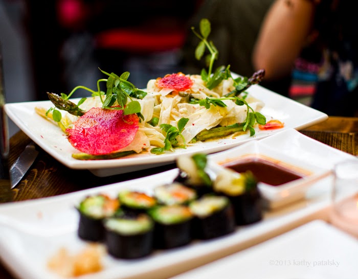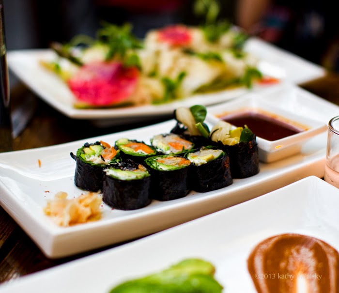 Philly Roll of Avocado, Kim Chee and Creamy Cashew Cheese tatsoi, hijiki, scallion, sweet chili sauce..