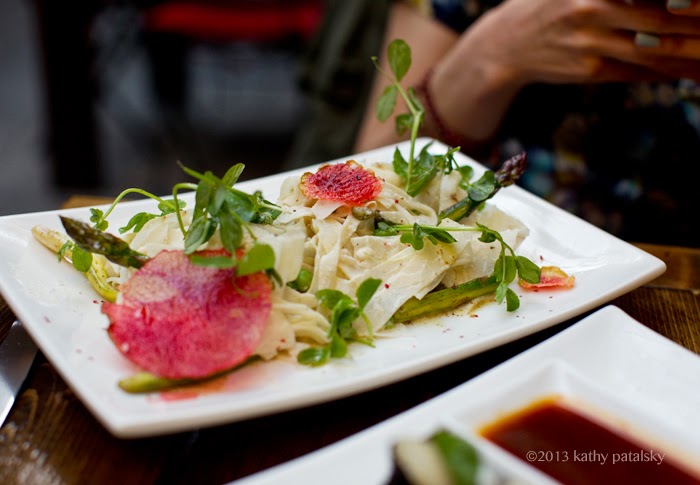 Salsify Noodles with English Peas, Asparagus, and Ramps pea greens, capers, lemon pine nut cream, watermelon radish crisps