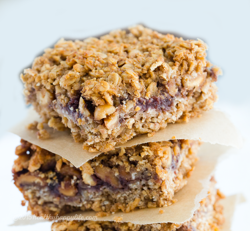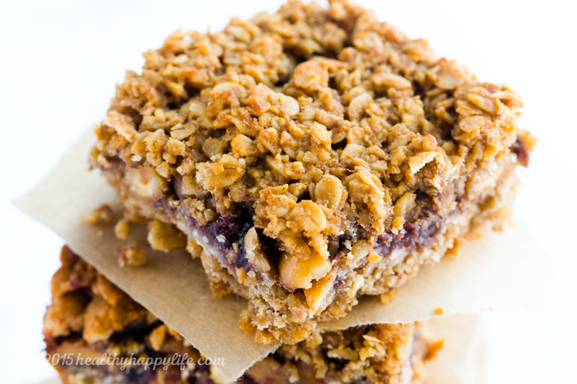 These tender, crumbly bars have a sweet peanut butter and jelly-ish flavor, and loads of complex carbs from the whole grain rolled oats.