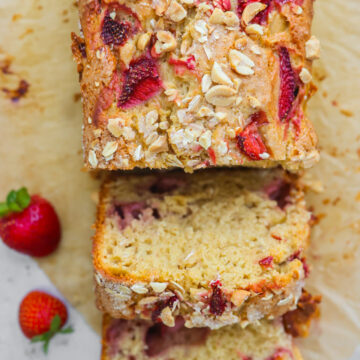 This plant-based loaf is both a bit savory and sweet and is a delicious treat or snack for anyone who loves a peanut butter and jelly sandwich. Or just some yummy baked goods featuring sweet summer strawberries.