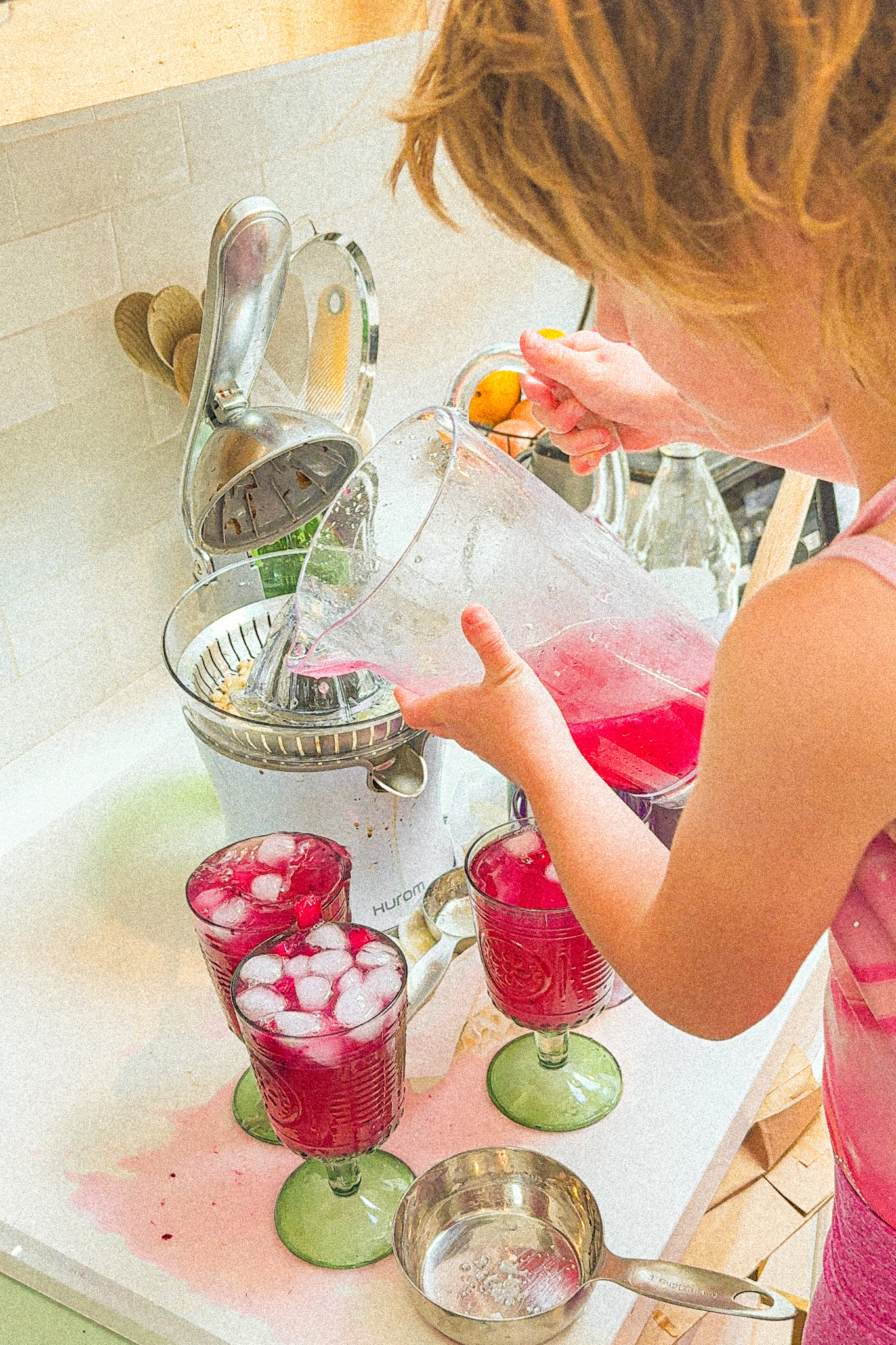 And suddenly there she was, standing on a stool, leaning over a pitcher of bright pink liquid, stirring with a tall wooden spoon, ice clinking against the glass, completely focused, completely in it. It’s such a small thing.