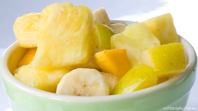 Tropical Golden Fruit. This salad uses mangoes, bananas, fresh-cut pineapple chunks, Meyer lemon juice and zest, and an exotic yellow plum.