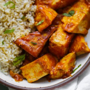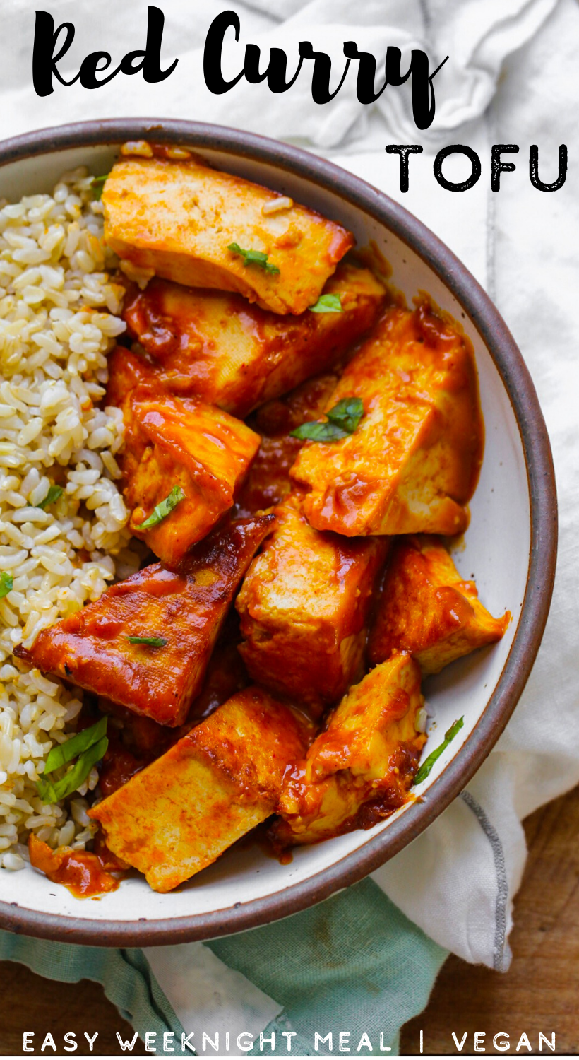 This vegan Red Curry Tofu has a warmly spiced, bright and fragrant flavor of red curry, accented with coconut milk and hint of peanut. Pair these fluffy bites of tofu with some white or brown rice and you have a nourishing anytime meal.