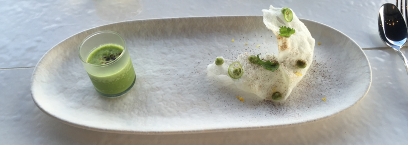 For dinner, both nights, we ate at the highlight dining option at The Cape. Manta. Manta is the fancy-yet-laid-back, fine dining option with views of the roaring waves. Comfy booths or outdoor tables await you. From the moment we had our complimentary small bite of this crazy-delicious avocado-infused savory-creamy puree and jalapeño-dotted crispy rice cracker, I knew I was in for a treat. The meal runs with courses. You can get 3-5 courses at various prices. There were actually plenty of vegan options even though this restaurant and the executive chef Enrique Olvera is known for his fish dishes.