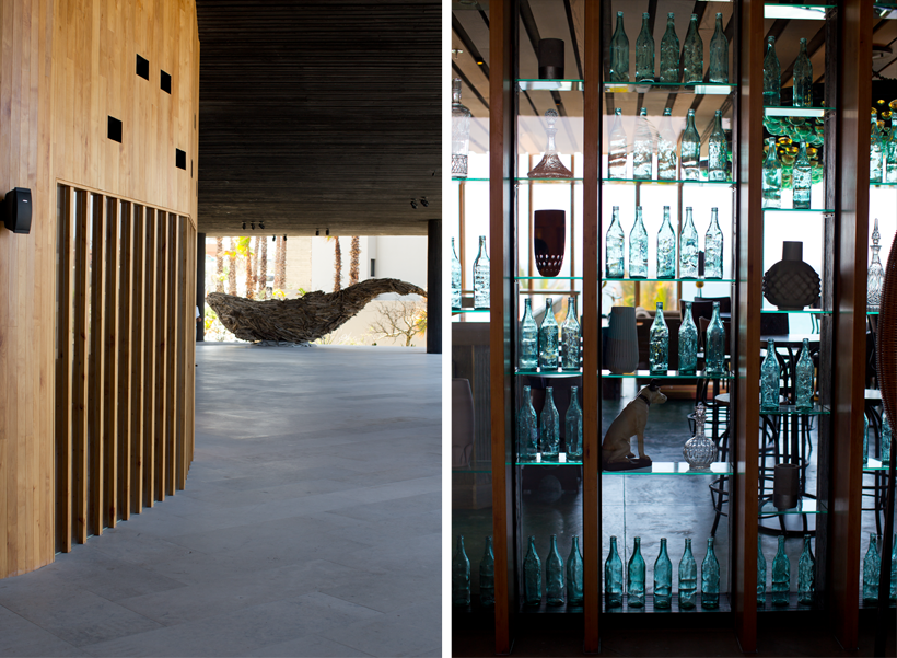 Loved the driftwood-art whale sculpture in the outdoor lobby and beautiful accents like green glass bottles catching the light..
